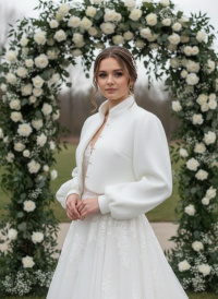 Жакет из ангоры молочного цвета с длинным широким рукавом и манжетом, полочки и спинка утеплены синтепоном, K-169 — это нежный спутник свадебного платья. Он гармонично сочетается со всеми моделями и фасонами нарядов, а также гармонирует с аксессуарами для бракосочетания, которые можно подобрать в нашем онлайн-каталоге.